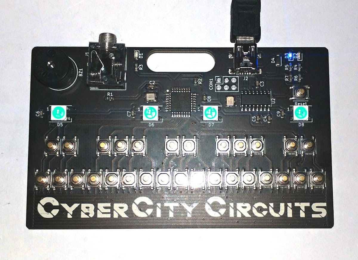 Cyber City Circuits has developed other badges, including a neat Mega Man badge and a rockin’ cassette tape-inspired badge. But those are basic and pretty much just light up a couple of LEDs. The Mini-Tone Keyboard Badge is different, because you can play it like a piano. A total of 29 tactile push buttons are arranged along the bottom half of the board. Those are enough to play 2.5 octaves — much less than a full-size keyboard, but enough to tap out some simple ditties. Sound can be output through the onboard speaker, or through the built-in 3.5mm audio jack.