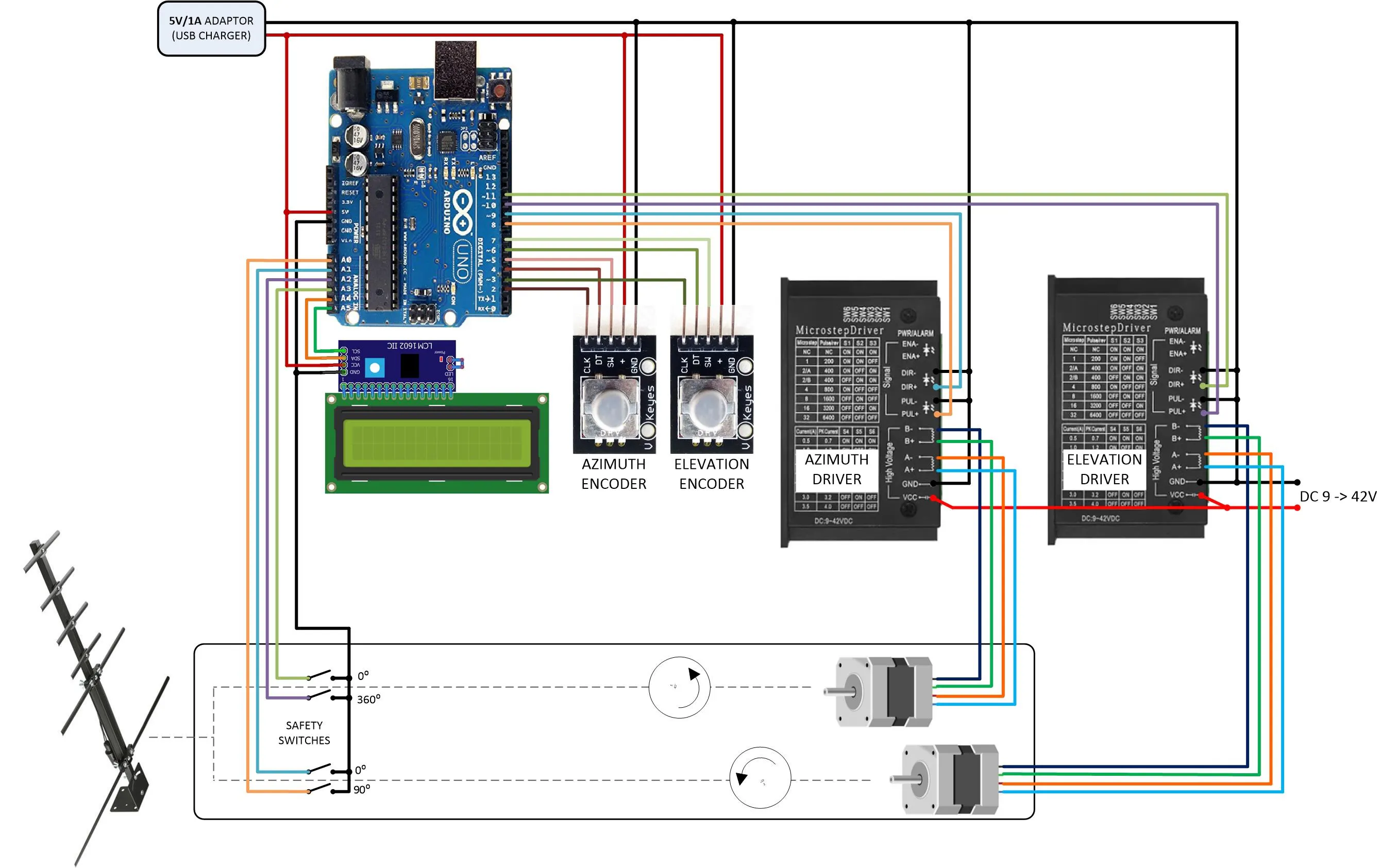 At boot time, the controller has no idea where the antenna is. It may be left on a certain position from the previous session. It could be on 90⁰, 123⁰ or even 0⁰, absolutely no information. If we don’t know the initial position, we can’t calculate the future movement. This is why we take the worst-case scenario, the antenna is all the way around, 359⁰/90⁰. The controller activates the motors for the maximum number of pulses (you just input above) in order to bring the antenna to zero. Even if the antenna was closer than that, you still have to wait until it hits the end-stop. This way we know for sure, at the end of this start-up phase, that the antenna is at 0⁰/0⁰, and from this point onwards we can precisely control future positions. The code and the schematic support the connection of safety switches. The rotor must have a hard stop at the end of the turn or safety switches, otherwise it may keep spinning until it breaks the wires. If you have a mechanical stop, the safety switches are not mandatory, the code can do without them.