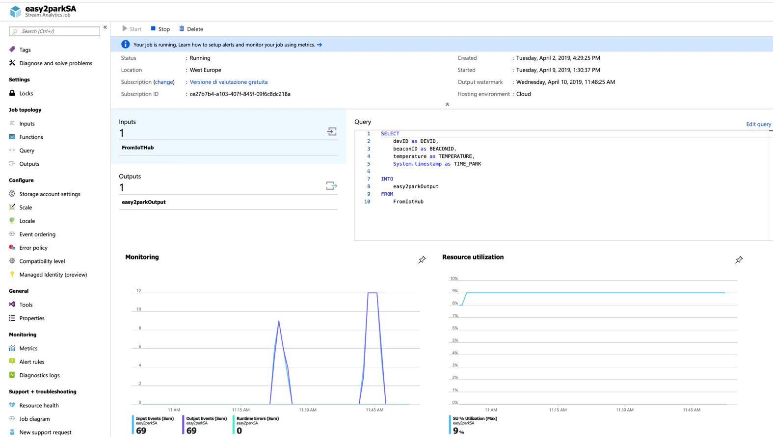Stream Analytics is characterized by an input source and an output source. In our case the input source is the Azure Iot Hub created as shown before, while the output source is an Azure SQL database. We need to configure both the input source (called job'sinput) and the output source (called job'soutput).
