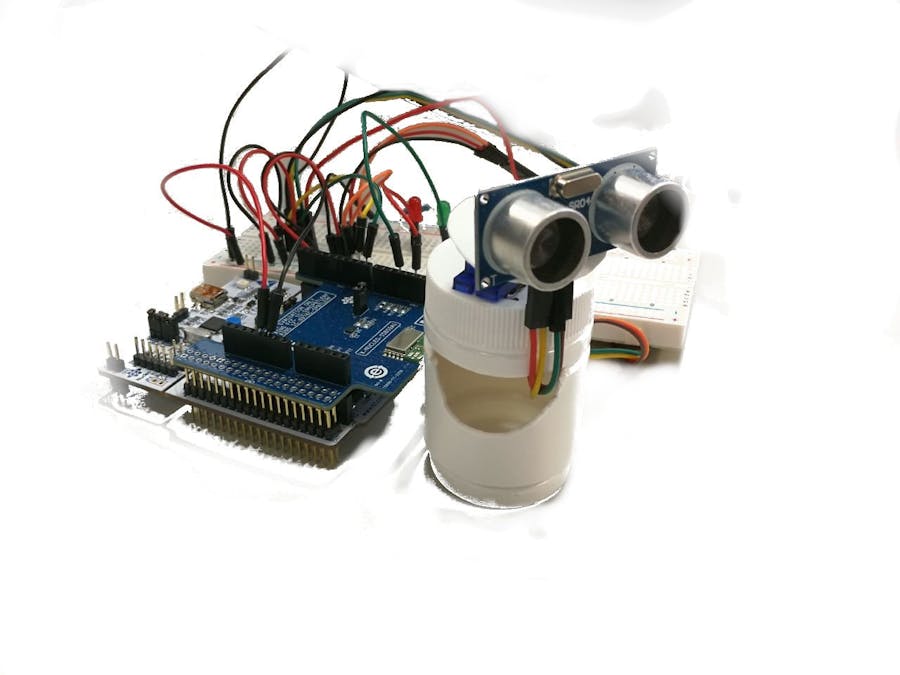 The ideaOur idea was to use an ultrasonic sensor attached to a servo motor to make possible an obstacle detection at 180 degrees and to implement from that an application capable of triggering and broadcasting an alarm to the users.