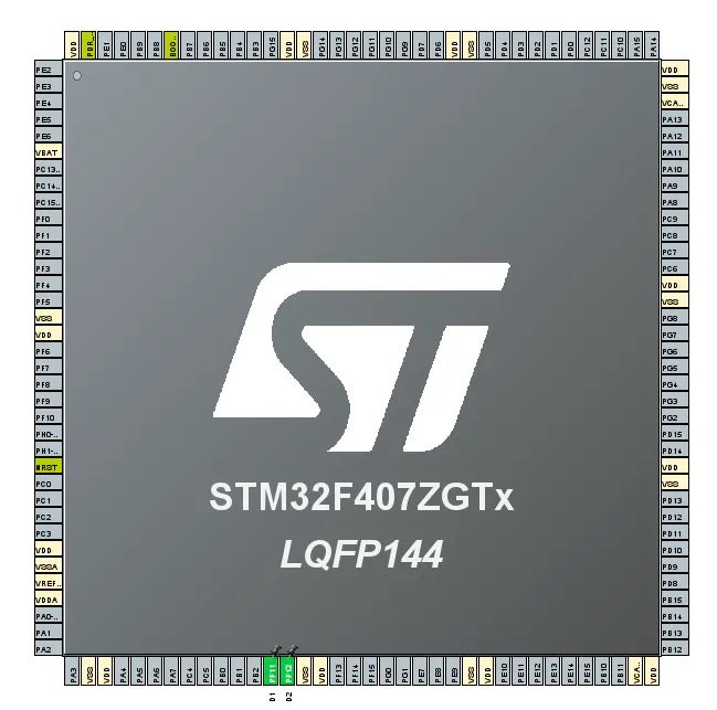 Zoom in and find the pin PF11 and PF12. Click each pins and select GPIO_Output to prepare them for code generation.