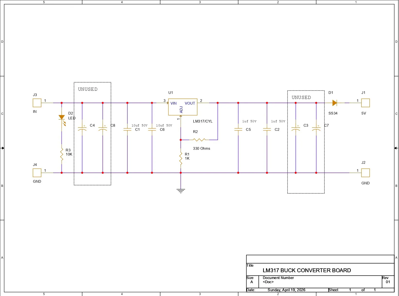 PCB DESIGNWe began the project by preparing the schematic for the buck converter board. We did this by studying the LM317 datasheet and creating a simple schematic that included the LM317 setup with two adjustable resistors connected between the adjust pin and the output pin of the LM317. To ensure stability and reduce noise, we added a 10µF SMD capacitor at the input and a 1µF capacitor at the output, which helps smooth fluctuations and improve transient response. We also added extra capacitor footprints at both the input and output in case different-value capacitors are needed later. The output voltage is configured using a resistor divider (330Ω and 1kΩ), which sets the desired voltage reliably.