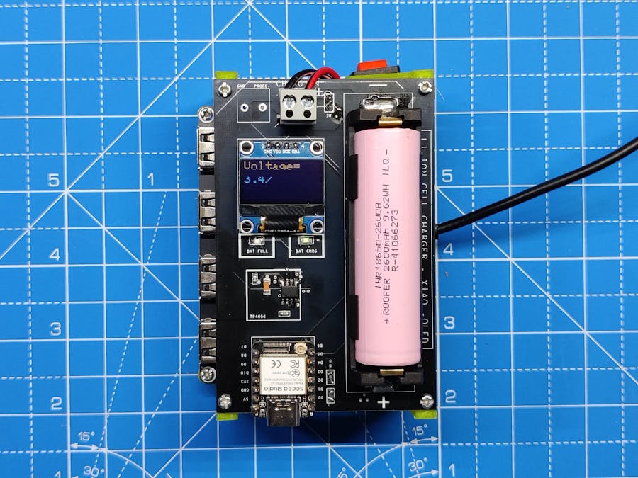 This Li-ion cell charger features an incorporated XIAO ESP32S3-based battery voltage monitoring system that shows the battery's current voltage as measured by a simple voltage divider circuit.