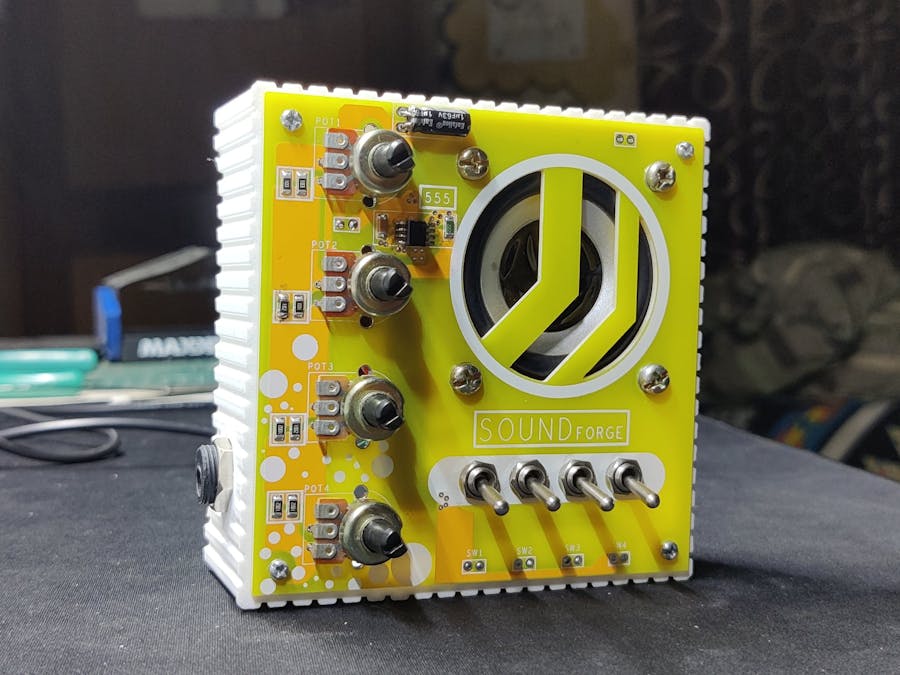 The SOUND FORGE is a 555 timer-based music box that uses a few lever switches and potentiometers to produce and modify sound.