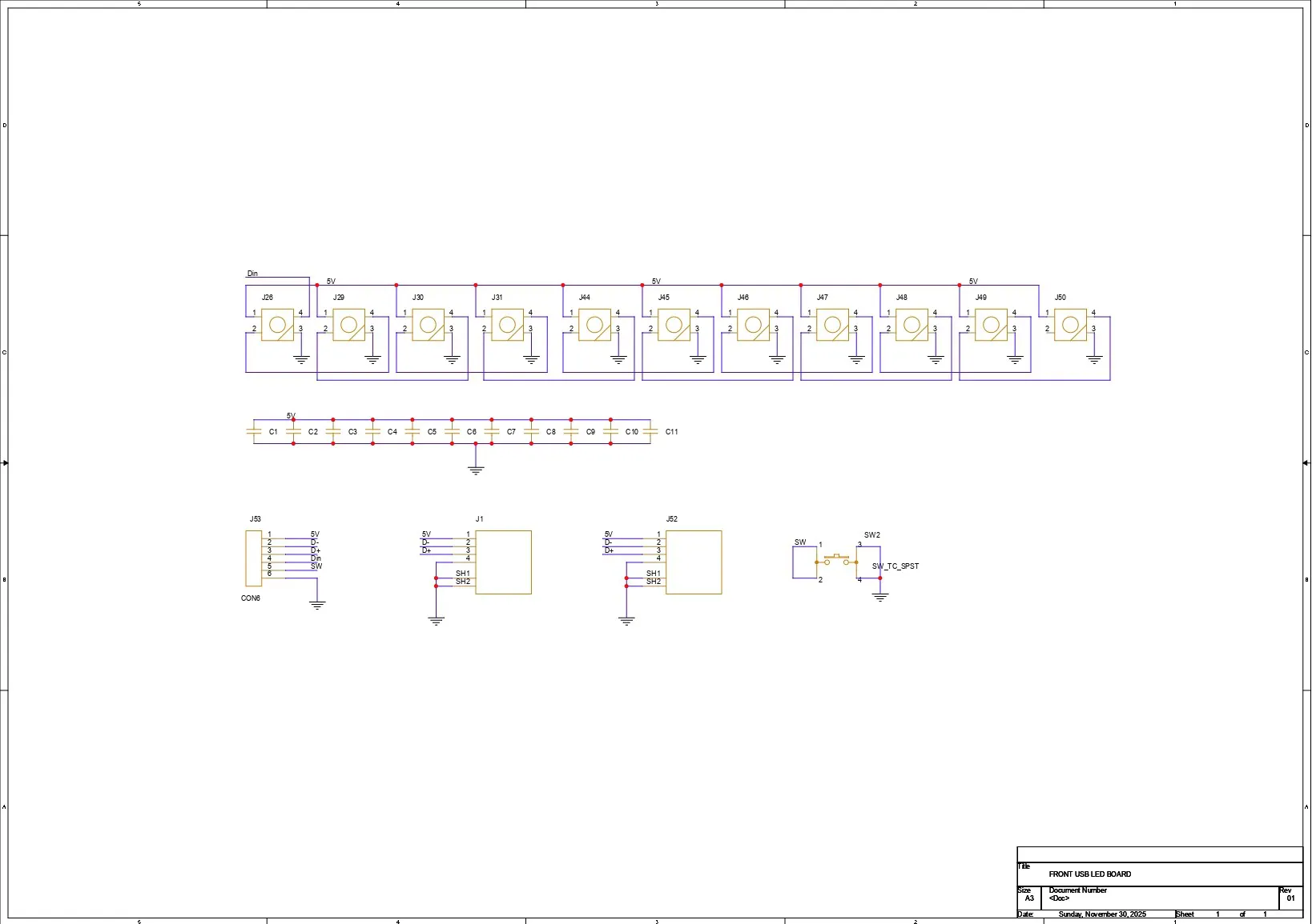 PCB DESIGN - FRONT IO BOARDFor the front I/O board, we added seven WS2812B LEDs connected in series, where the DOUT of the first LED goes to the DIN of the second, the DOUT of the second goes to the DIN of the third, and so on up to the seventh LED. Each LED has its own decoupling capacitor, for which we used 100nF 0805 package capacitors.