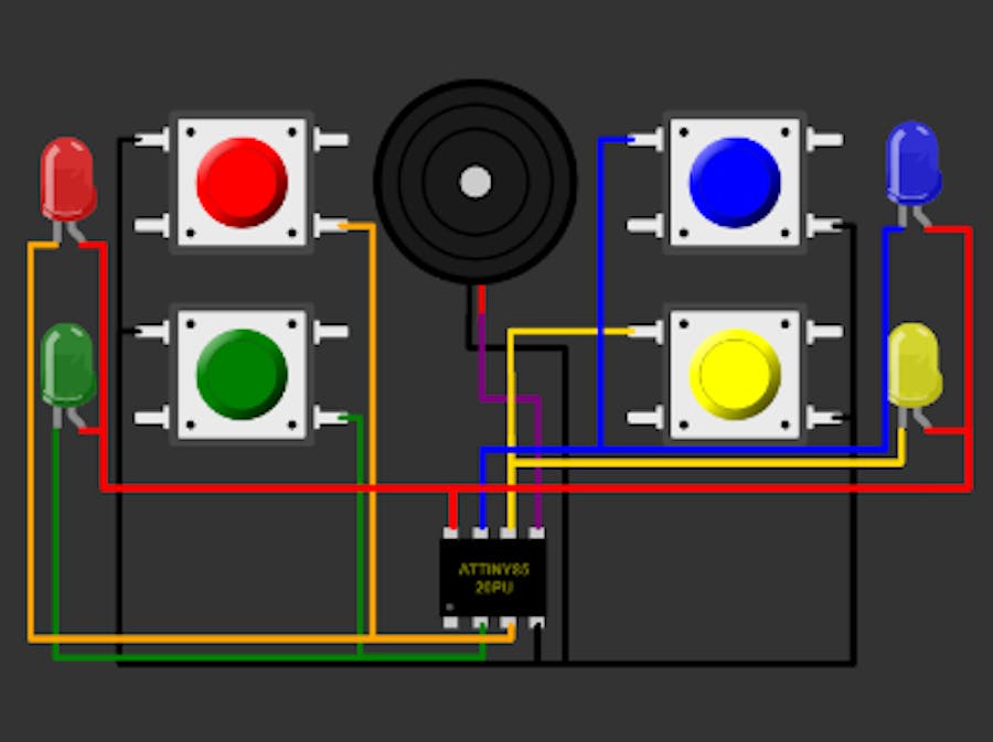 Simon is a simple electronic memory game: the user has to repeat a growing sequence of colours. The sequence is displayed by lighting up the LEDs. Each colour also has a corresponding tone. In each turn, the game will play the sequence, and then wait for the user to repeat the sequence by pressing the buttons according to the colour sequence. If the user repeated the sequence correctly, the game will play a "levelling-up" sound, add a new colour at the end of the sequence, and move to the next turn. The game continues until the user has made a mistake. Then a game over sound is played, and the game restarts.