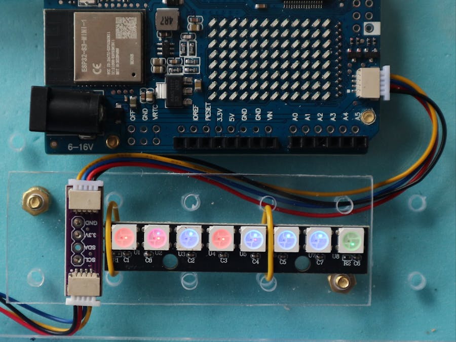 The ARDUINO UNO R4 WiFi offers a second I2C channel called Wire1. The SDA and SCL lines are connected to pins 26 and 27, which are not available otherwise. Both pins can be used by the Adafruit Neopixel Library. WS2812 strips normally should be operated by a voltage of 5 volts, while the Qwiic channel (Wire1) only feeds 3.3 volts. Does it work nevertheless? Obviously it does.