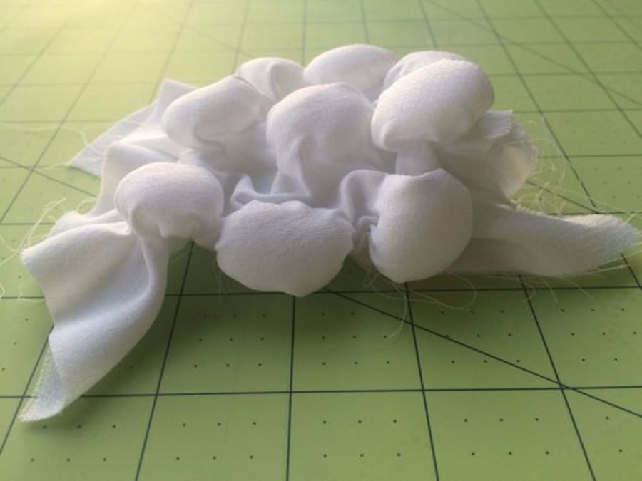 Step 2: Manipulate the SurfaceThere are many different ways you can manipulate the edge of the fabric. You can twist it into spikes, wrap small objects in it, sew in gathers, or pleat it into geometric shapes. I decided to wrap some glass craft stones for this example. If you’re wondering if the glass breaks because of the heat changes involved, the answer is yes, but rarely and it doesn’t make a difference in the results when it does since everything is tied into place.
