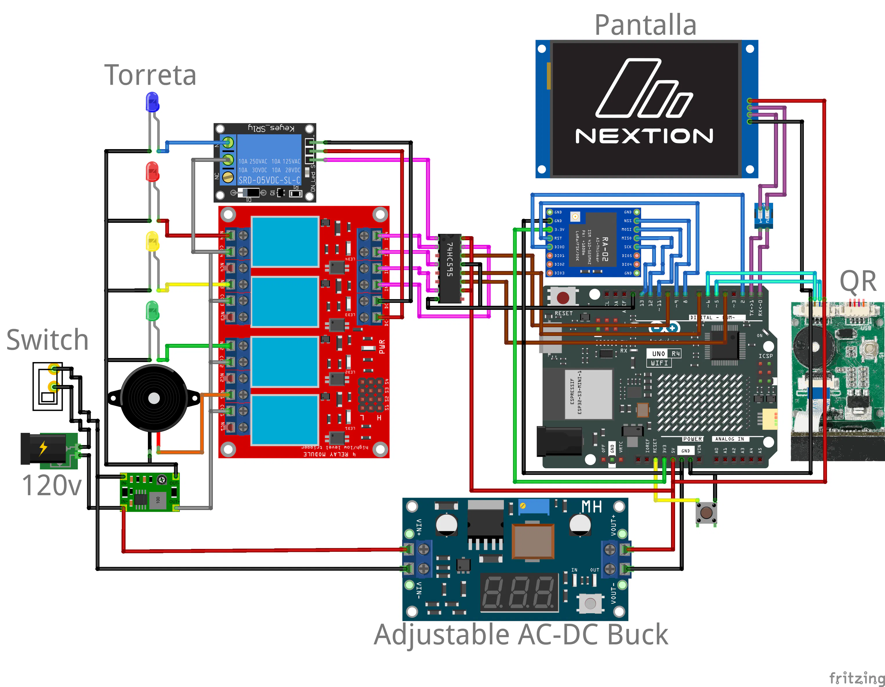 The system integrates multiple industrial and communication technologies, including QR code identification, LoRa wireless communication for long-range data transmission, an industrial signal tower (stack light) for real-time visual status indication, and a Nextion HMI display for local user interaction and control.