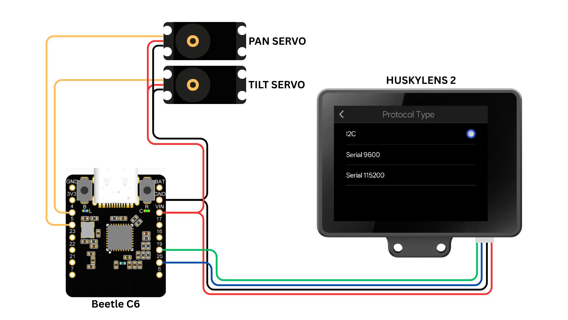Using two servo motors and an ESP32-C6, we’ll create a smooth pan-and-tilt mechanism that allows the HuskyLens V2 to physically track a target. As the AI detects a face, object, hand, or pose, the ESP32-C6 reads the tracking data and adjusts the servo angles accordingly — keeping the subject centered in the frame.