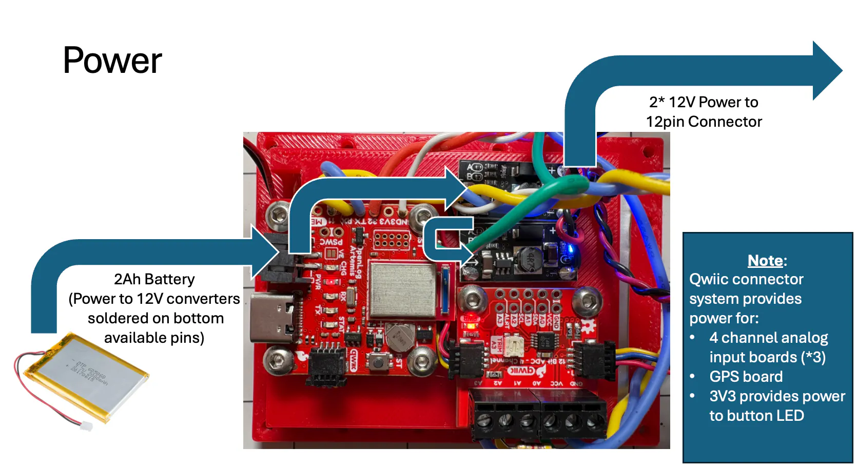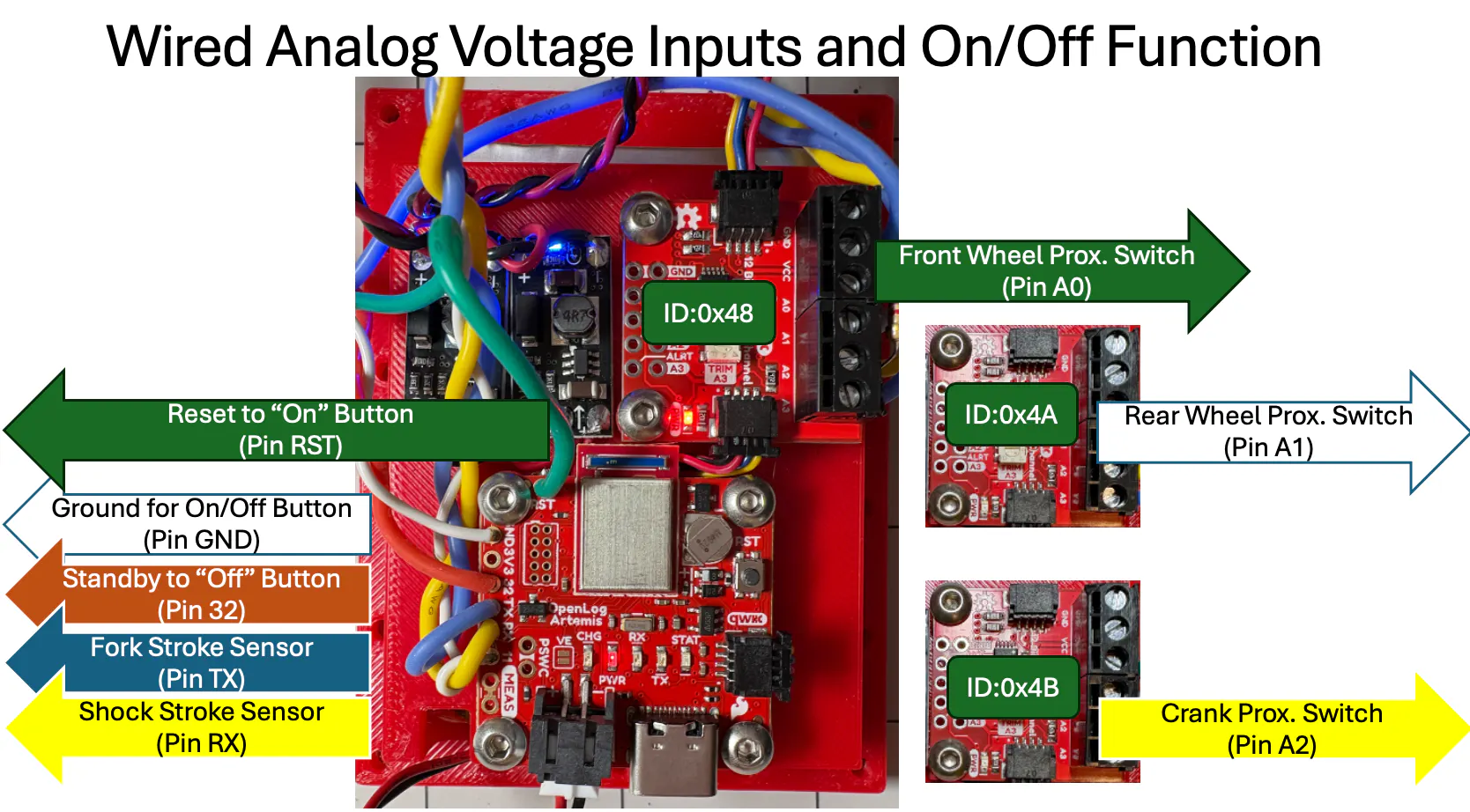 - Voltage divider is used to reduce voltage for Artemis OLA board. This is built into wiring harness.