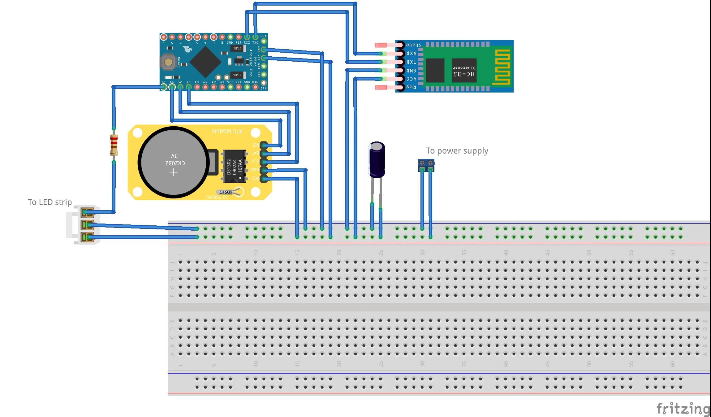 The LED strip is connected to the pin 10 following the instructions from Adafuit. The DS1302 RTC module needs 3 pins, CLK, DAT and RST, wich are connected to the pins 11, 12 and 13. Finally the HC-06 Bluetooth module are connected to the RX and TX serial pins. I used a perfboard to connect all modules, with some connectors to make easier to replace/remove anything.