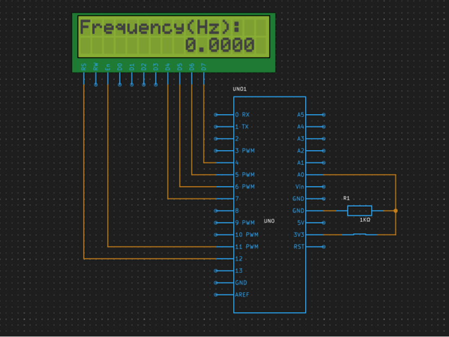 When the switch detects a high signal, it triggers the Arduino UNO to start counting the pulses. The frequency is calculated by dividing 1000 by the average duration of the pulses. The result is displayed on the LCD, allowing users to read the frequency of the external signal source. This frequency meter can be used in various applications where pulse frequency measurement is required, such as in electronics testing, signal analysis, or educational demonstrations.