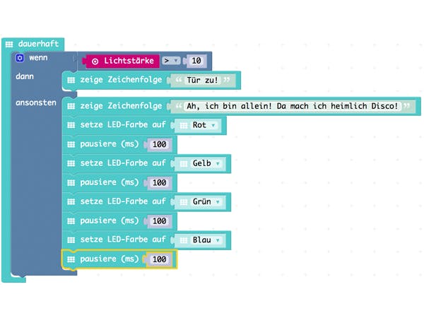 Check if the door of the fridge is open or not. Put in a Calliope mini into the fridge and let it measure the light intensity. When it's all dark, Calliope makes a little party for herself, when the door opens (and thus it gets light), it tells you to close the door.