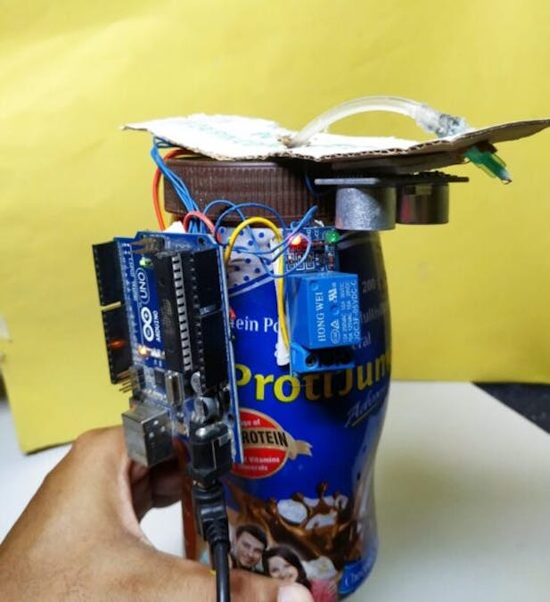 There is an ultrasonic sensor that can identify the presence of anything in front of it. You just need to bring your hands under the sensor and it will automatically drop some drops of the sanitizer liquid on your hands with the help of a DC water pump controlled by Arduino. There are two terminals in the ultrasonic sensor one is TRIG and another ECHO which are responsible for the communication. Please put your hands at a distance of 10 cm or less from the ultrasonic sensor so that it can work properly.