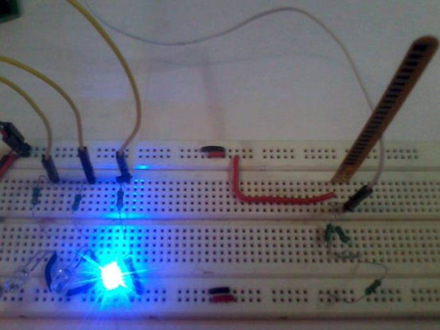 With no bend in the flex sensor, only blue LED will glow whereas a small bend will turn on the green LED. On applying large amount of bend, red LED will glow, while the remaining two LEDs will be turned OFF, indicating a large bend.