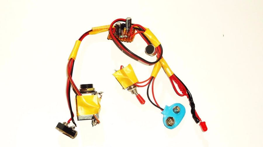 Now you can build the circuit on a perfboard. Be a bit careful because this has a number of of board components like the mic, switch, battery connector, LED,etc. Solder them carefully and then run a hobby knife or hacksaw blade between all solder joints to prevent any unwanted pieces of solder from hanging around there. Use heatshrink tubing or insulating all wires. I also used it to group them for ease.