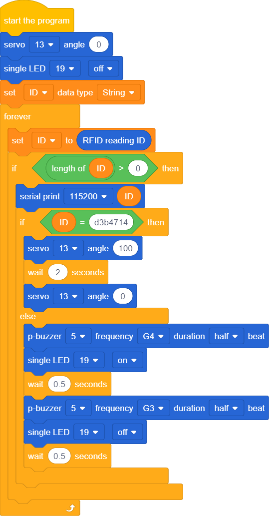 - Initialize the RFID reader, servo, LED, and buzzer.