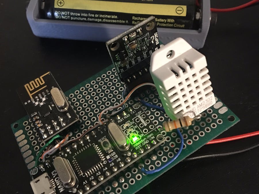 This is a project I put together that is basically two sensor stations: a base and a remote station. The base station features the powerhouse of the 'duinos; the almighty MEGA! Its connected to the internet by a ESP8266-01 and connects to the remote station via 2.4GHZ nRF24L01 chips. A DHT22 rides on its back via a proto board that the ESP and nRF chips share with it. The remote station can reach anywhere in my house and relays back its sensor data roughly every 2 min. It features a doughty BMP280 for temperature and barometric pressure data, another strapping young DHT22 sensor for humidity, and between it all, a crafty voltage divider for measuring the ever fleeting 18650 lithium batteries. The batteries I have currently are suffering from fatigue and don't stay around much longer than five to seven days. It took me a couple days of wrestling with the nRF24L01 chips to get them to play nice together but finally got it. I'm currently working on adding in another remote station that feeds its data back to the Mega and runs on battery too hopefully for much longer.