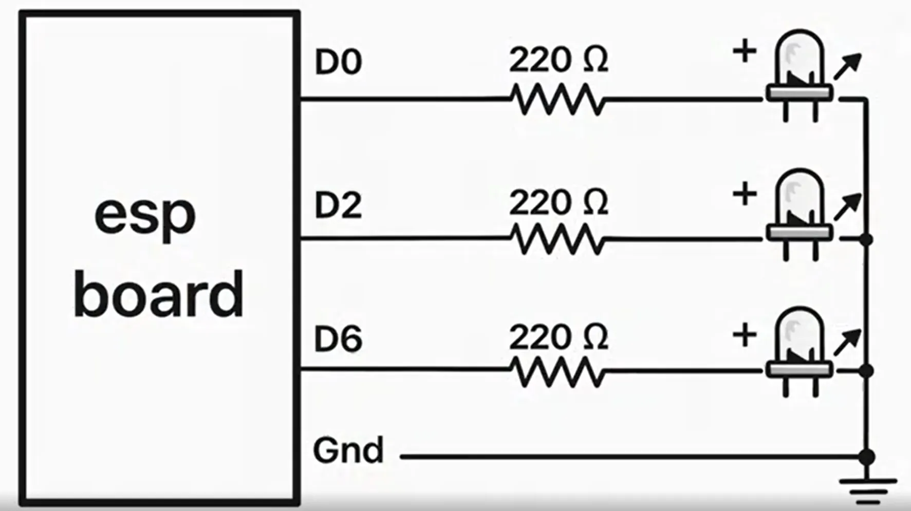 Step-by-Step InstructionsStep 1: Circuit Assembly Insert the ESP8266 module into your breadboard. Connect the three 220-ohm resistors to pins D0, D2, and D6. Connect the positive terminal of each LED to a resistor, and short all negative LED terminals together to the GND (Ground) pin on the ESP module.