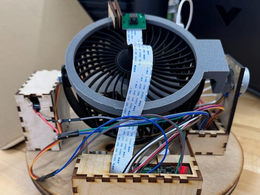 We also implemented a y-axis rotation mechanism to allow for fan rotation. In this stage, we used a servo motor. While we knew that it had limitations in terms of torque, the approach sufficed for this milestone. Combined with the bounding box from our face-tracking algorithm, we were able to tilt the fan up and down to reposition the user's face in the vertical center of the frame.