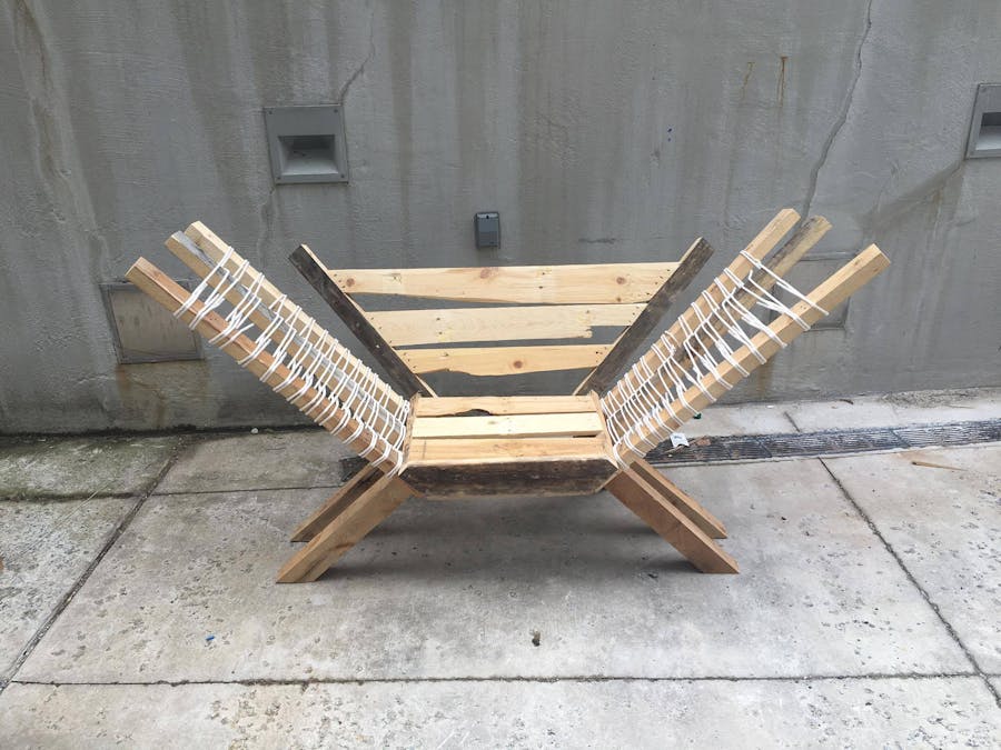 Spider chair, spider chair, does whatever a spider chair can. Can you sit? Yes you can! Made of wood not sand. It's a spider chair! It all began when Dave gave me the challenge of deconstructing a pallet. I then researched Etsy pallet projects and famous deconstructionists. The design of the chair was decided after 50 mind spill sketches of chairs, couches, and table stands. I liked the idea of a spider because of the natural flow of it's identity. Every piece of wood in the chair is from the two deconstructed pallets.