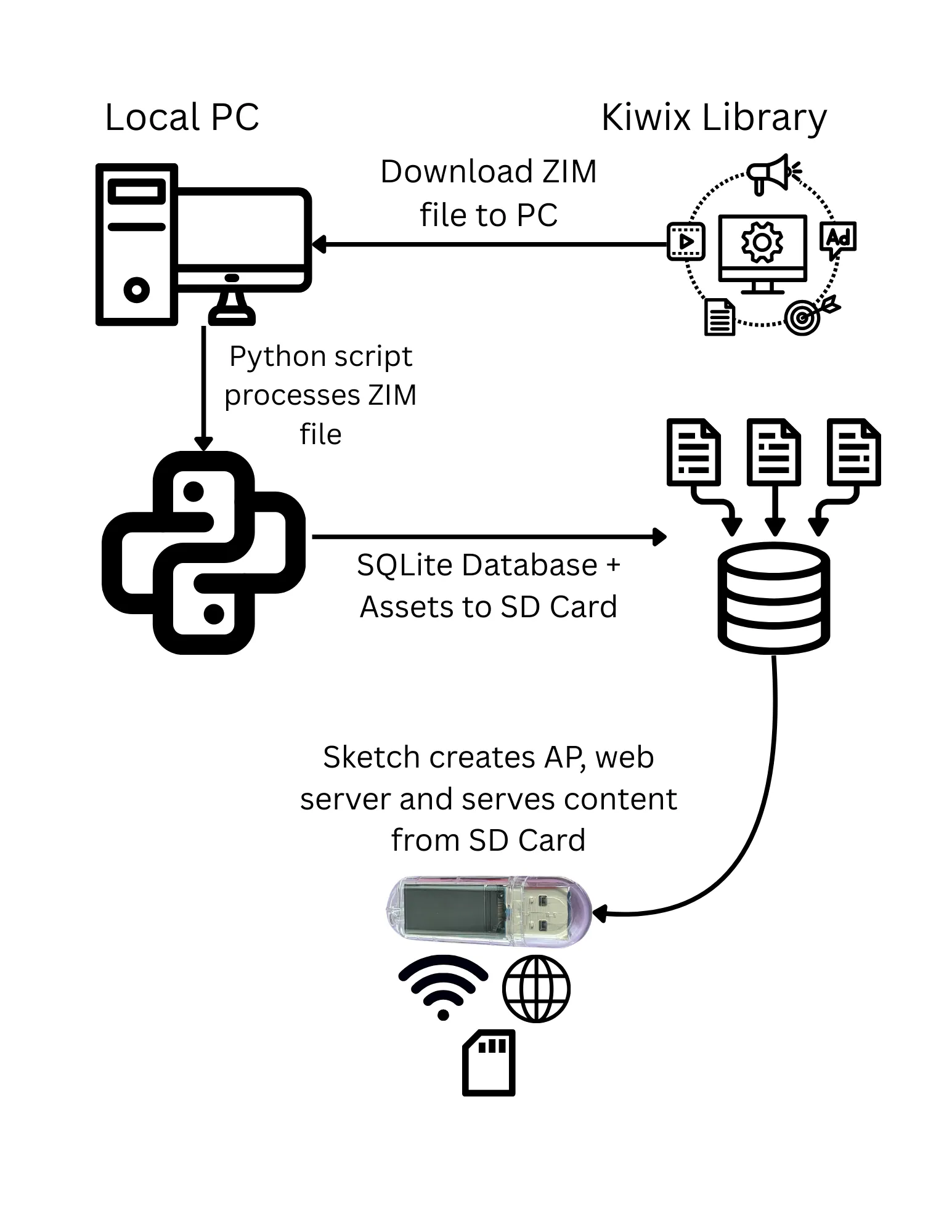 Technical OverviewThe following diagram gives an overview of the entire process of taking Kiwix libraries (https://library.kiwix.org/) and serving them from the T-Dongle: