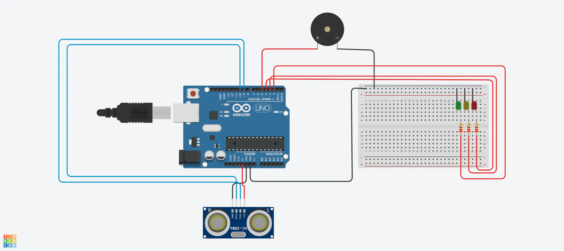 - Critical Zone (< 20cm): The red LED stays on, and the buzzer emits a continuous high-frequency tone, signaling an immediate stop.