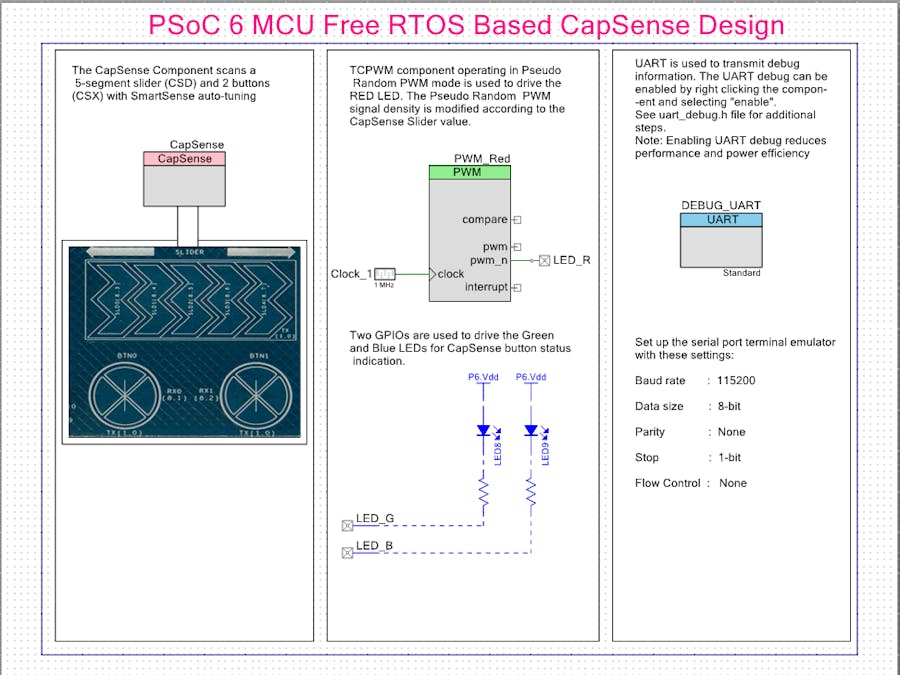 The project includes CapSense configuration implementing two buttons and a five-element slider, FreeRTOS configuration on Cortex-M4 and FreeRTOS task implementation for CapSense and LED interface. In addition, the project defines and implements the CapSense exit/entry callbacks through the “cyapicallbacks.h” file. The CapSense task initializes the CapSense block, scans the widgets periodically, processes the widgets after each scan and notifies the LED task to display the output.The LED task controls the RGB LED. The slider value controls the intensity and the buttons control ON/OFF states of the LEDs. The CapSense entry/exit callbacks provide the CapSense task resume/wakeup functionality on CapSense scan completion.