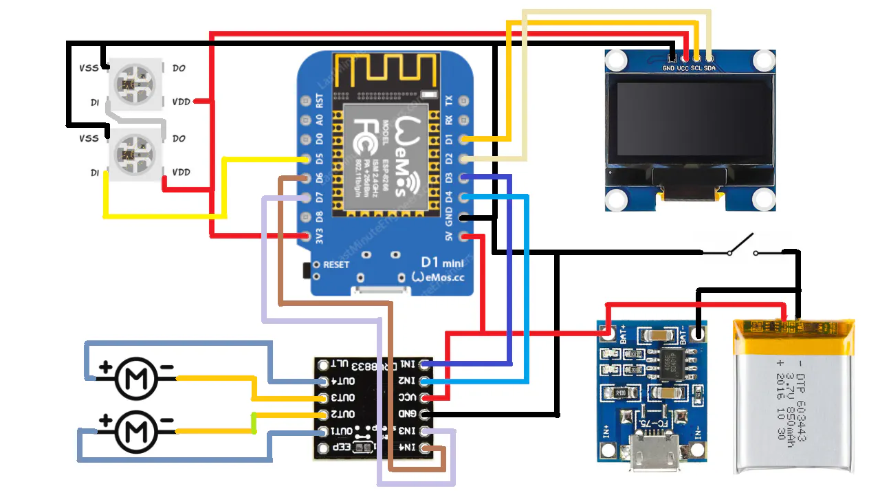 3D Printing and AssemblyAll parts were 3D printed on my own design and build, the DSN D1 3D printer, which is designed for high speed and quality. The 3D models themselves are published on my Cults3D page : https://cults3d.com/en/3d-model/game/rc-tank-mini-car-arduino-based