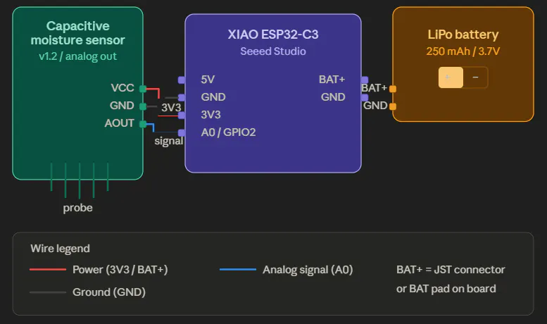 For the #EarthDaywithSeeed community campaign, I created a battery-powered smart soil moisture monitor using the Seeed Studio XIAO ESP32-C3 and a capacitive moisture sensor — all powered by a tiny 250mAh LiPo.