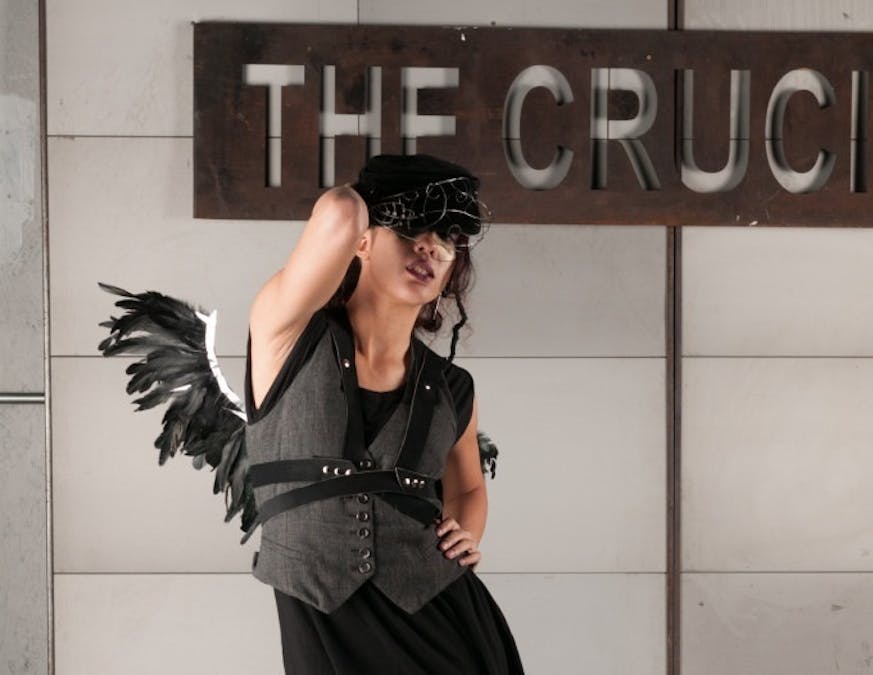 In early 2013, I presented a couple of brainwave accessories at Hot Couture, a “fashion sculpture” show at the Crucible in Oakland. It was unforgettable. As I wrote to Kristy Alfieri, the chief producer: the whole thing was stressful and took up much of my life for the time I was working on it, and I’m glad it’s over… but WHAT an experience! I joined the crowd whenever I could, goggling at the artistry of my colleagues, the swagger of the models, the mind-blowing production quality, and the sheer overwhelming excitement of the entire weekend. I’ve rarely (if ever) been so intimidated by a project, nor so proud to take part in an event. I couldn’t believe my own work was up on a runway alongside the others’, flanked by fire, being flaunted by such cool and talented women.