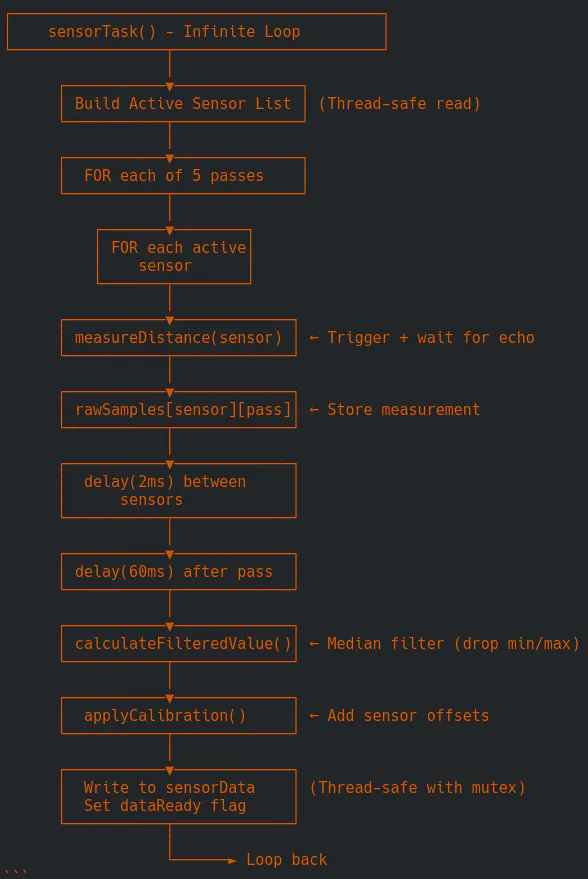 Technical Challenges Solved1. Dual-Core Sensor ProcessingWith 8 ultrasonic sensors, timing is critical. Each HC-SR04 needs a trigger pulse and blocks while waiting for the echo (up to 23ms timeout). Processing all sensors sequentially on one core would create unacceptable latency.