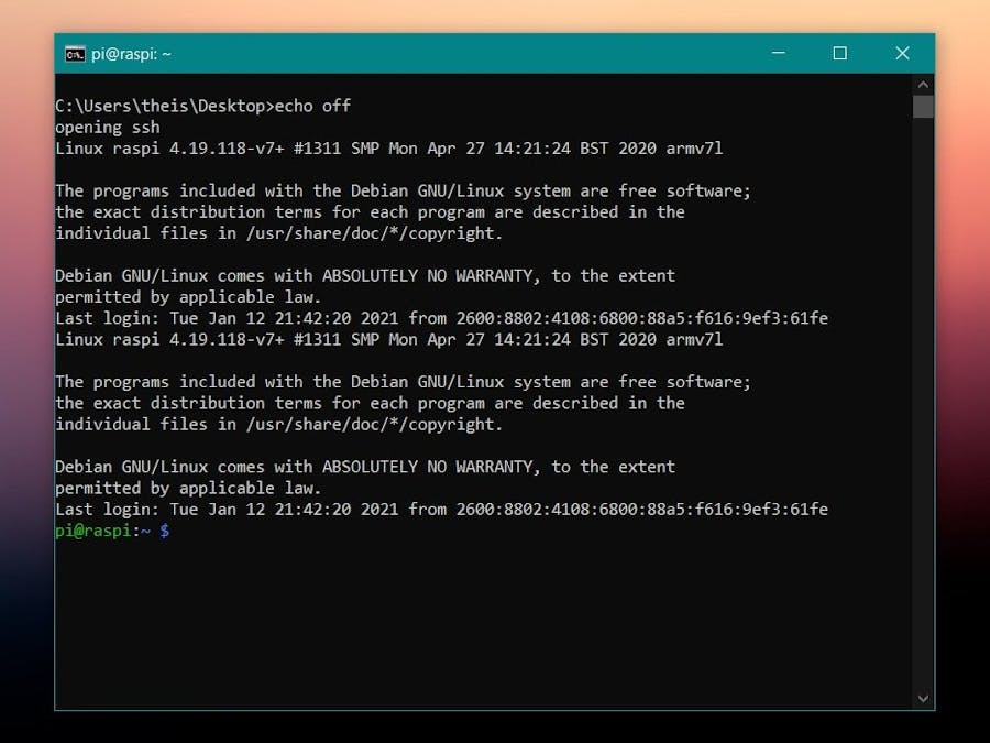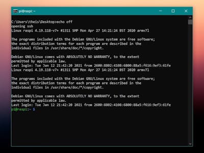 1. Passwordless ssh loginThe first step I needed to take was to get windows to automatically login to the ssh session for me. As it turns out, this is actually a lot easier than I had thought it would be. The way we can do this is with a ssh key that is shared between my computer the raspberry pi that will take the place of any passwords you may have to use.