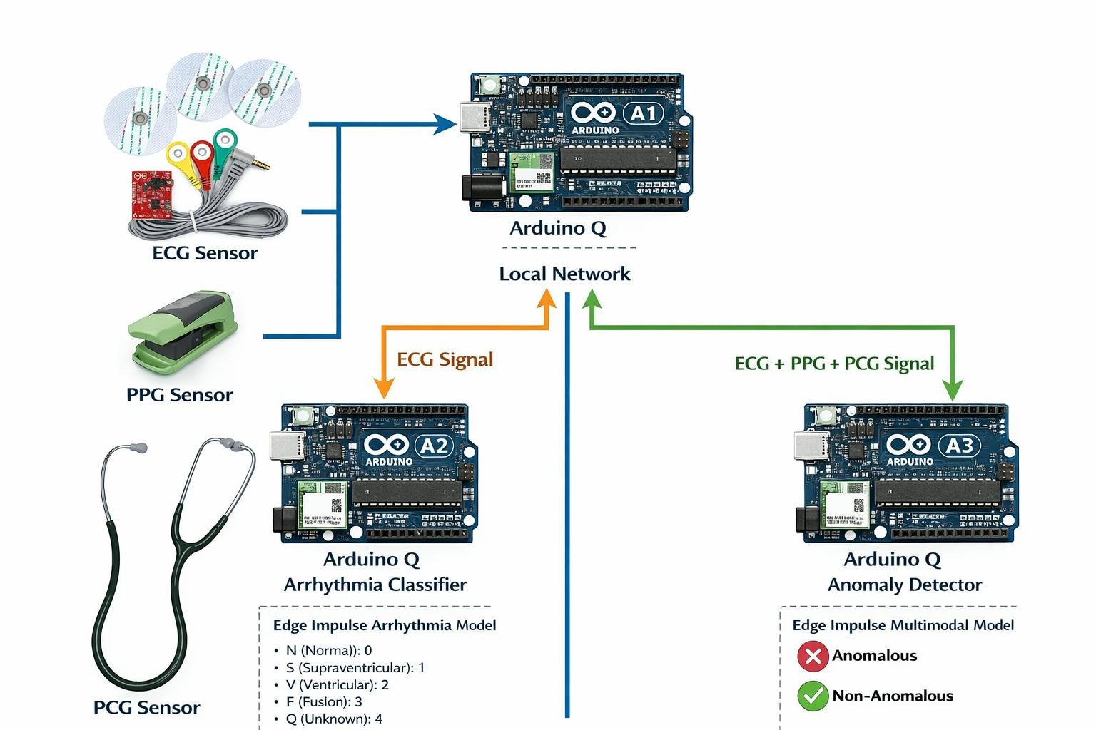 - The multimodal anomaly detection model was deployed on Arduino-Q3, where ECG, PPG, and FCG signals are fused to determine whether the combined physiological pattern corresponds to a normal or anomalous condition.