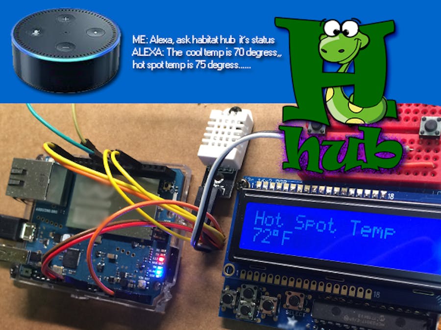 Habitat Hub is an Arduino based unit with multiple sensors and display that helps monitor environmental conditions of a reptile or amphibian terrarium. The display rotates through the temperature areas, humidity, water level and last time the water bowl and cage was cleaned. If there is WiFi access, the unit has the ability to connect to Amazon Alexa to report back these conditions.