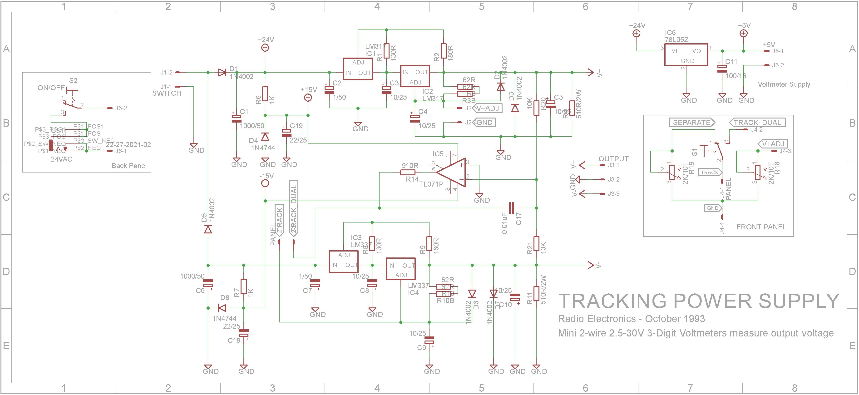 While the schematic shows wiring for dual tracking and separate adjustment of the individual positive and negative outputs, R19 (Negative 10K multi-turn Pot) and S1 (Separate, Track Dual switch) was removed in the final build. J4-1 and J4-2 connections were permanently joined so the power supply only operated in Track Dual mode.