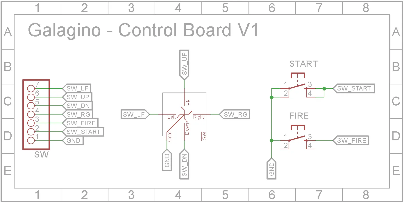 One of the changes that was made was to replace the four tactile switches that made up the joystick in the original with a more reliable 5-way switch. This along with the other two buttons are mounted to a printed circuit board