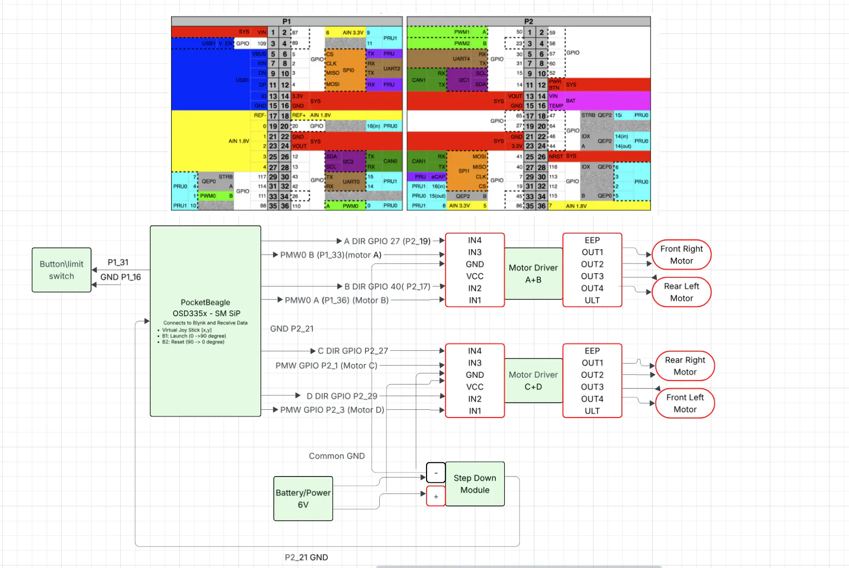 Prep WorkI did have to do some soldering for this project, including the motor drivers, the motors, the step down module and a male connector to the battery pack. I personally enjoyed doing it, especially the motor drivers. Note that when soldering the DC motors, make sure the head of the male wire is not touching the motor at all, or else, it will get heat up and melt into it. I also used a heat gun to heat up some coverage for the wire for the battery wiring so that they are not sticking out. For project like this, I found it helpful to have a detailed system block that includes all the pins' connections. For the motor drivers specially, it will be way easier to code and reference.