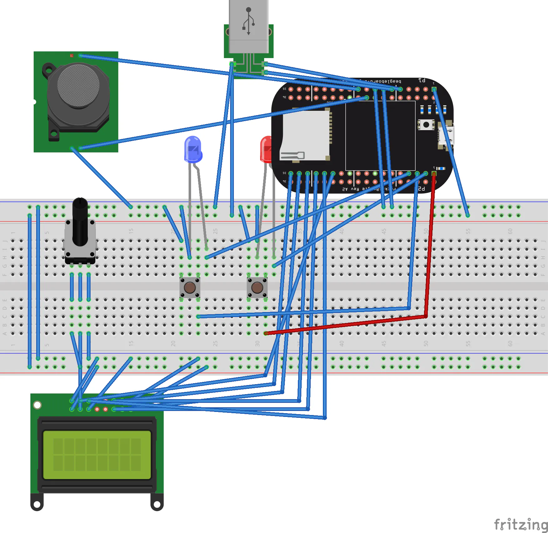 Once the program starts, all you have to do is hit the red button to start recording. The red LED will light up, showing that recording is happening and allowing instant feedback on performance. Once you hit the red button again, the PocketBeagle will stop recording. All of these [recordings] will save to a folder that will allow you to access any recording by using the screen. Once you have selected the recording you desire by scrolling with the joystick, all you have to do is hit the blue button to start playback, and if the M-Audio system is plugged into a speaker, it will work. The program is set up to start on boot using crontab, so this system will turn on when the entire system turns on to increase ease of access for technologically-challenged band directors.