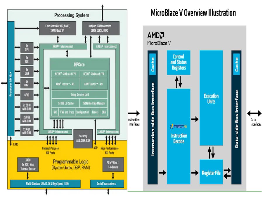 Microblaze has been a trusted workhorse for softcore microprocessor implementation on FPGAs. Microblaze is a 32-bit RISC Harvard architecture microprocessor softcore, which means processor instruction and data are accessible on separate buses. Recently, with the 2024 release of Vivado, Microblaze has been upgraded to RISC-V architecture, providing a free-of-cost gateway to leverage the open-source RISC-V software ecosystem on FPGAs. Zynq, on the other hand, is an All Programmable System-on-Chip (APSOC), which means it has a dual-core ARM cortex A9 microprocessor implemented on silicon fabric along with an Artix-7 equivalent Programmable Logic (PL). The ARM cortex A9 processor can be configured using the Zynq IP provided with Vivado at no extra cost. The ARM processor on the Zynq chip can be used as a primary microprocessor to implement embedded Linux or FreeRTOS, while on the other hand, the MicroBlaze processor can be used to control a peripheral sensor at bare-metal level, providing a leaner parallelised system implementation. With recent changes made in Vitis IDE, making it to transition towards a Visual Studio Code based Unified IDE from the Eclipse based Classical IDE, this article is intended to serve as an entry point for developers trying to leverage the combined performance of PS, PL, and Microblaze V on Zynq 7000 chip with Vitis unified IDE. Zedboard is used as the hardware platform for implementation in this article.