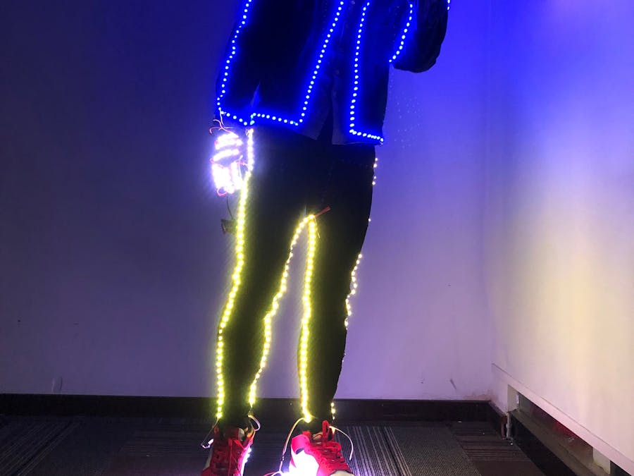 Fix the WS2812B SMD LED Strip to the clothes with hot glue, upper body hats, tops, and gloves are controlled by mega2560, and lower body pants and shoes are controlled by UNO R3 and fixed with hot melt adhesive. Then connect the battery to the UNO DC port.