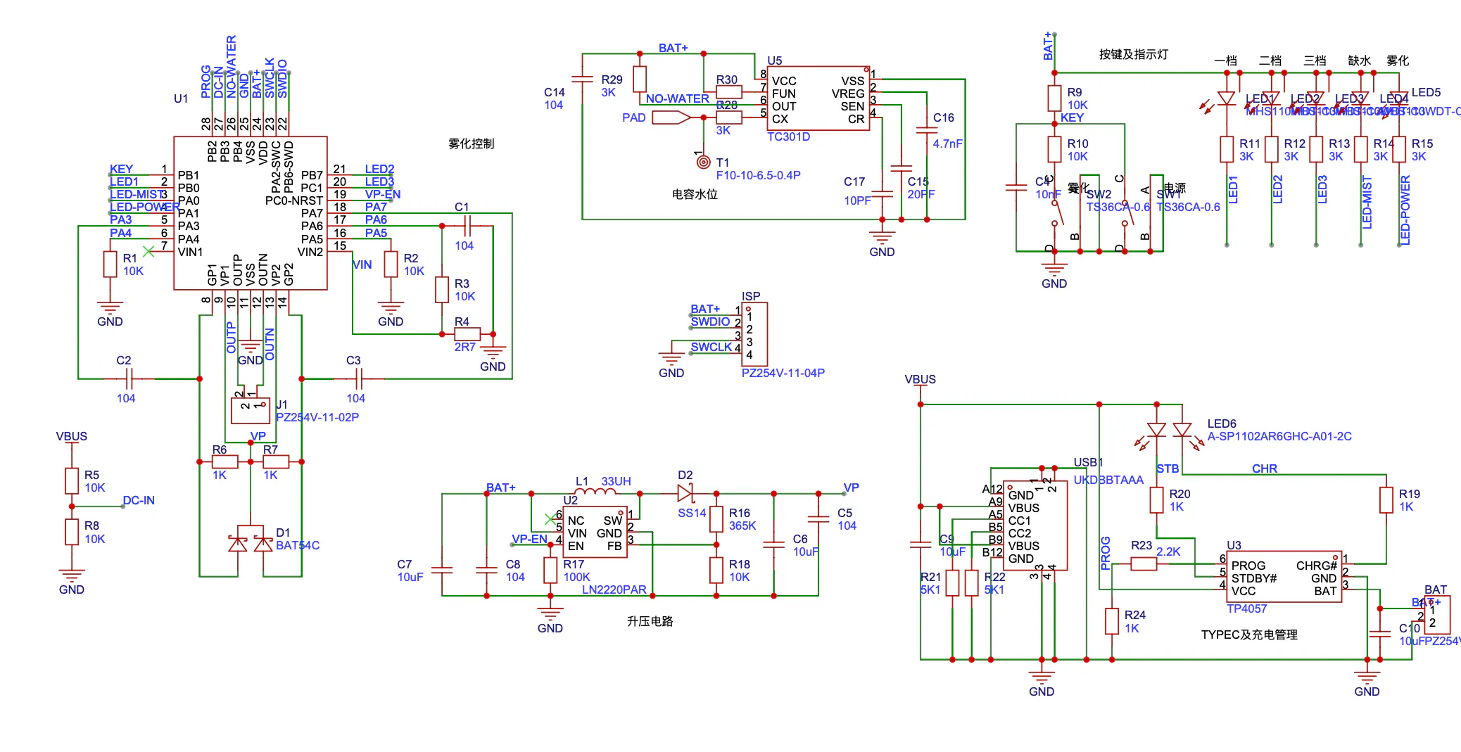 Schematic designed for a portable Vibrating Mesh Nebulizer (VMN). Its main function is to drive mesh atomization with drive IC LX8201, voltage boosting and water detection.