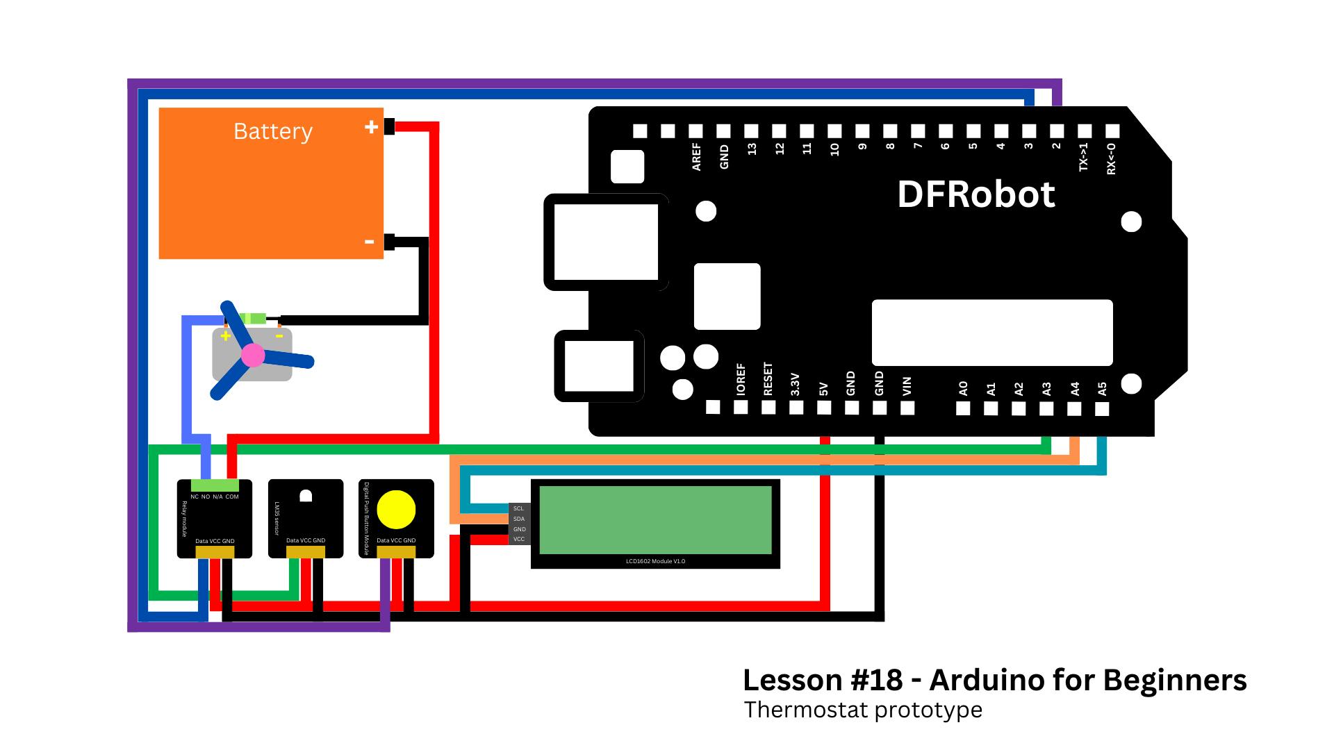 After finishing the wiring, go to the GitHub repository for this series. Open the folder for lesson 18, download the file thermostat-prototype, and open it in the Arduino IDE.