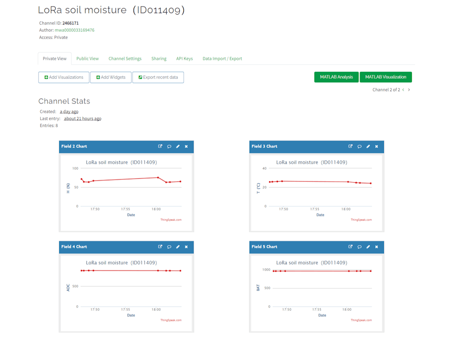 delay(2000);Step 4: ResultsInsert two AAA batteries into the Lora Temperature/ Humidity/ Soil Moisture Sensor V3 battery compartment, burn the code into the ESP32S3 based 4G LTE module, and open the serial port, when ESP32S3 based 4G LTE module successfully receives the Lora Temperature/ Humidity/ Soil Moisture Sensor V3 information, it can extract the data and request the URL of the write channel of Thingspeak to upload the data to the "Private View" page.