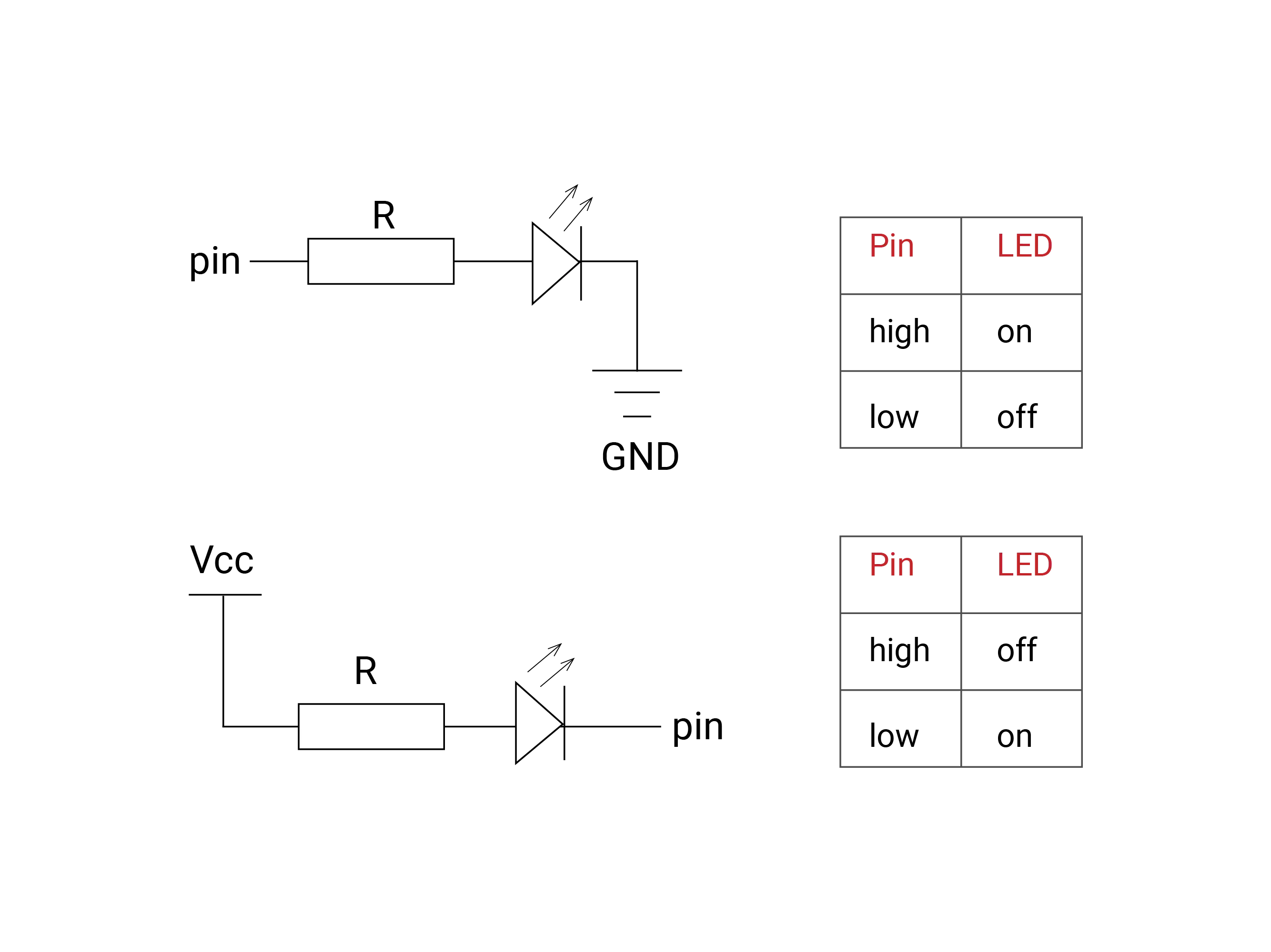 - Connect the LED to the digital pin and ground. If the pin outputs a high voltage, the current flows from the pin to the ground, the LED will be on. If it outputs a low voltage, the LED is off.