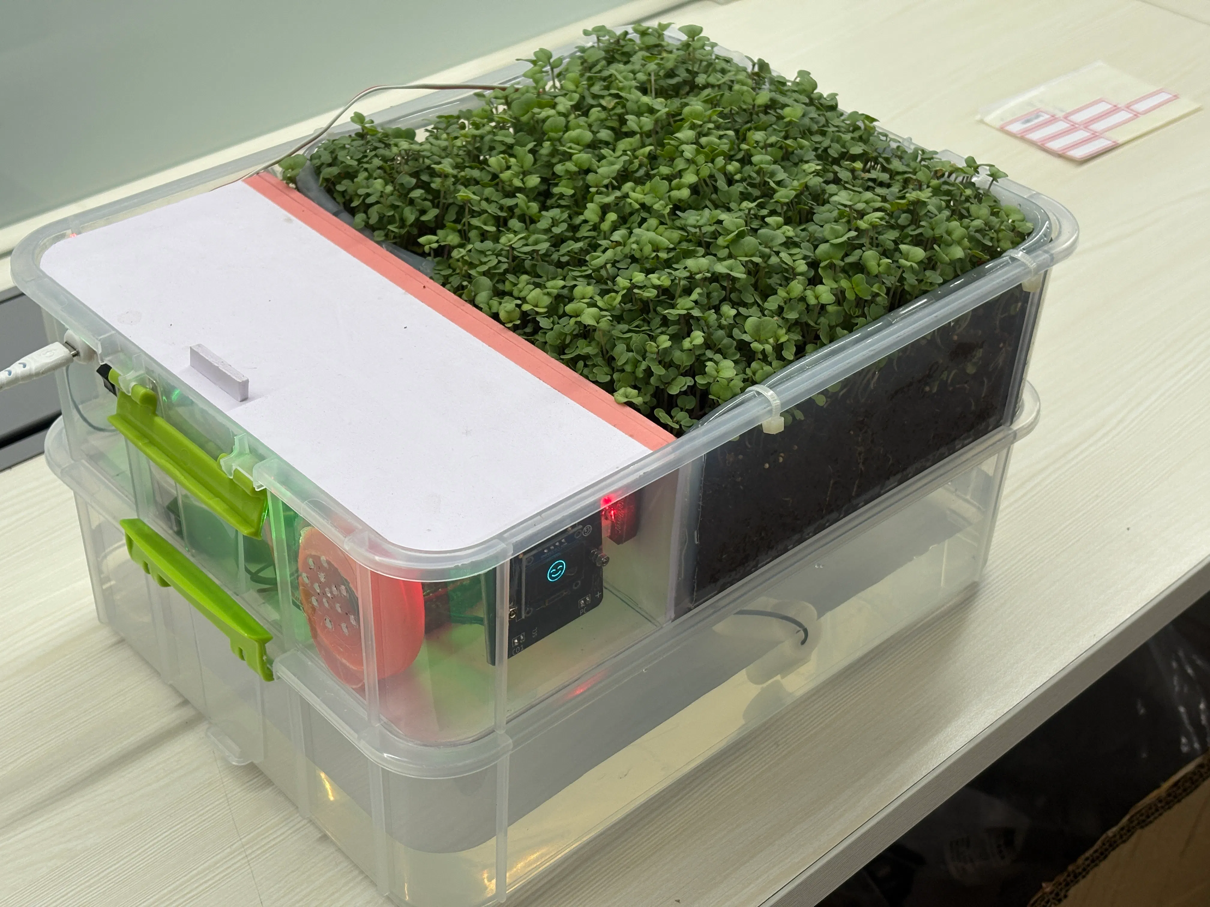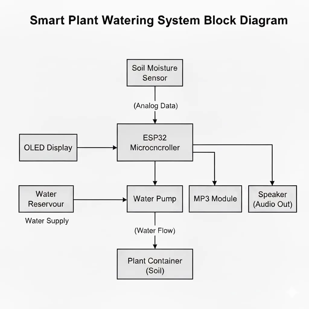 The system works with an ESP32 board connected to a soil moisture sensor, a small water pump, an OLED screen, an MP3 module with a speaker, and two plastic boxes—one used for planting and the other for storing water.