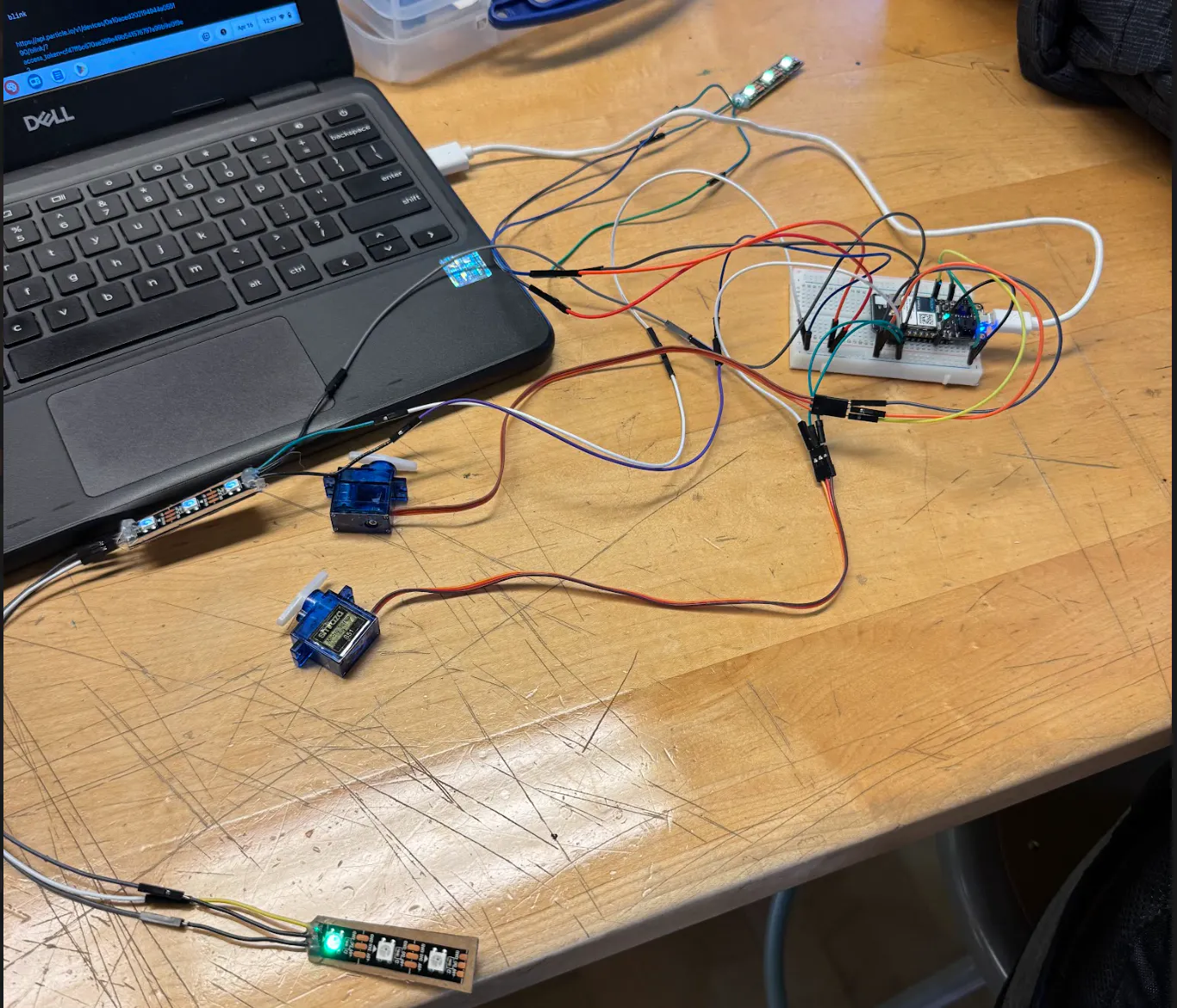 Clock: The original goal for the clock was to have both the hour and the minute hands work. The minute hand worked well enough on its own, however, difficulties arose when trying to work with the hour hand due to the overall placement of the servo and tape roll (which would act to spin the hour hand as the wooden stick spun the minute hand).