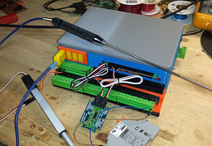 Early prototype of RDAX greenhouse environmental control system prior to incorporation of 3D print technology. Supports multiple temp humidity monitoring points, fan/heater control, vent dampers, door/window positions and lighting.