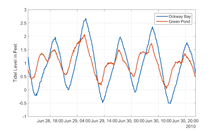 Reading NOAA’s Tidal Analysis and Prediction reveals that the timing and amplitude of tide levels is highly dependent on location. Note in this chart the significant difference in the tidal measurements between two bays, Green Pond and Ockway Bay, which are only six miles apart on the south shore of Cape Cod.